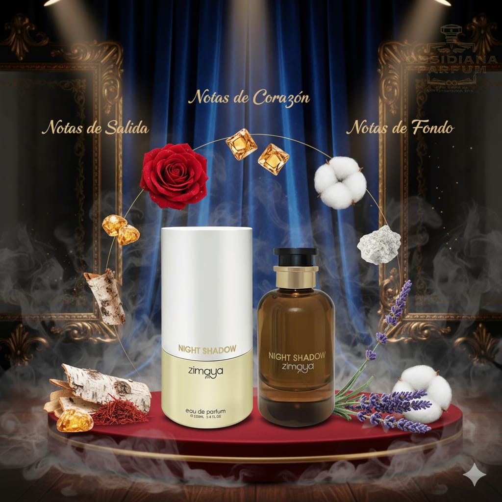 NIGH SHADOW zimaya ORIGINAL ⚜️ es una fragancia poderosa que revela tu presencia con notas de salida intensas de abedul, azafrán y ámbar. Su corazón mezcla almizcle, rosa y ámbar para un carácter audaz y sofisticado. La base fusiona lavanda, ámbar gris y almizcle, creando un rastro seductor que perdura, ideal para quienes buscan dejar una huella inolvidable.